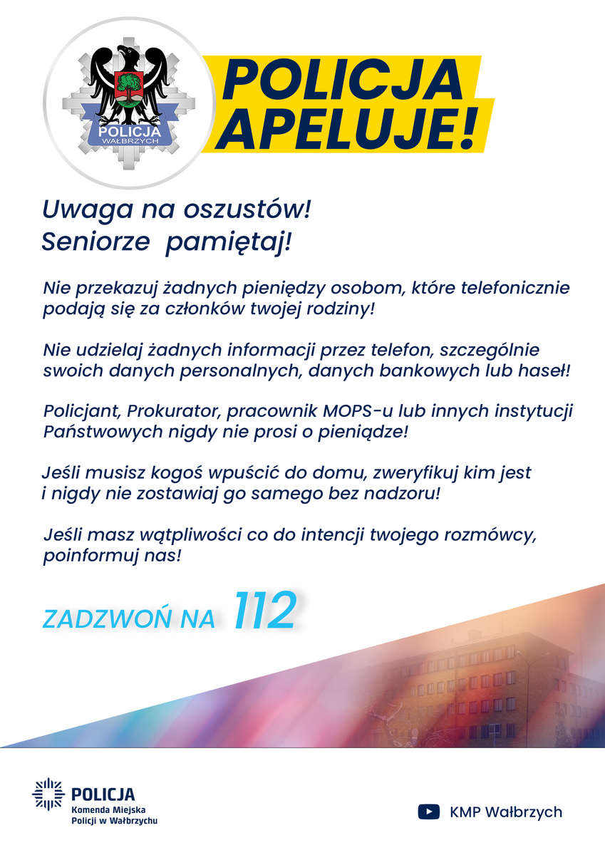 Rozmawiajmy z naszymi bliskimi – z rodzicami, dziadkami, sąsiadami. Uczulajmy ich na metody działania oszustów. Wspólna czujność i świadomość zagrożeń to najlepsza forma ochrony. Bądźmy ostrożni. Nie dajmy się oszukać.